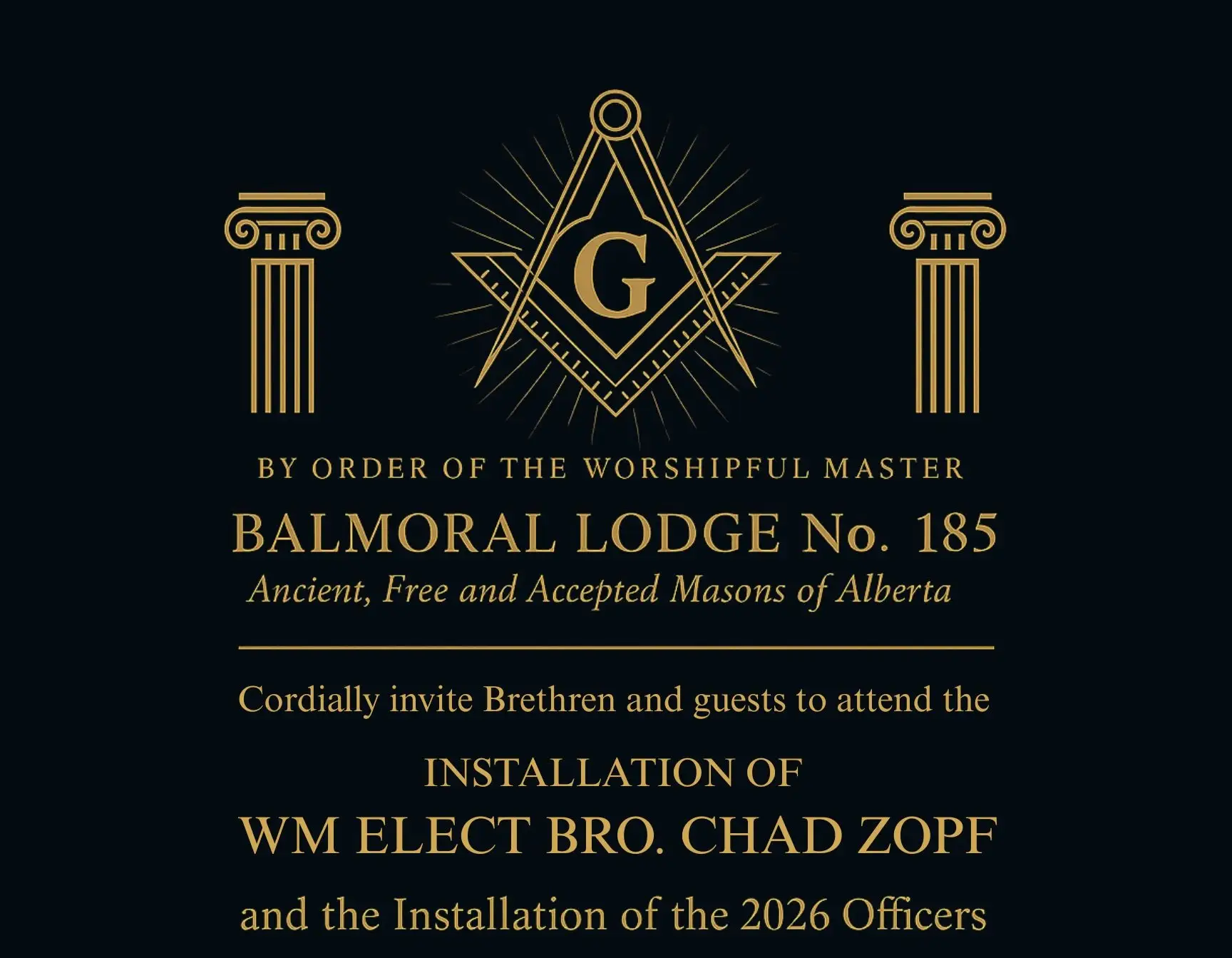 Acacia Masonic Hall 10433 - 83 Ave NW, Edmonton, Alberta, CanadaInstallation and investiture of lodge officers for 2026. Lodge tyles at 7:30 p.m. Banquet to follow ceremony - $40 per ticket.